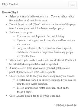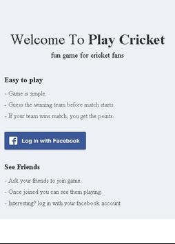 Login into Play Cricket with your Facebook Id. Select the cricket match before it starts and save your selection.