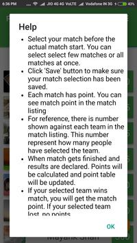 * Each match has point. You can see match point in the match listing. For reference, there is number shown against each team in the match listing. This number represent how many people have selected the team.