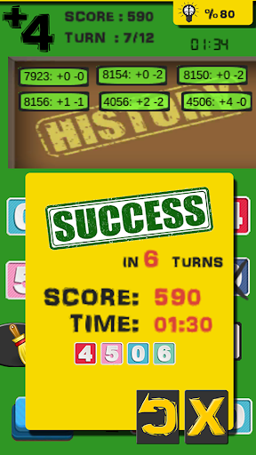The goal of Plus 4 - Mastermind is to find 4 digits number code which game engine generates within 12 turns. During game play, player have to do guesses by using clues from previous guesses to find secret 4 digits number code.