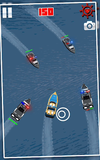 You are a runway driver escaping from police in the open water with your speed boat and chased by the high speed police boats. Don't be a fool to be caught by navy police, Just hold you acceleration of boat and dodge them as long as you can. Be careful to not hit the rocks or police boats. There are rock in sea as a hurdle. Collect cash for unlock new speed boats, your boats have three lives unless it hits with the rocks.