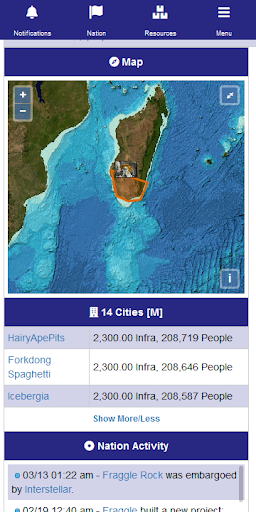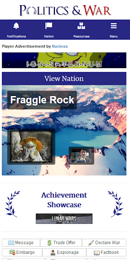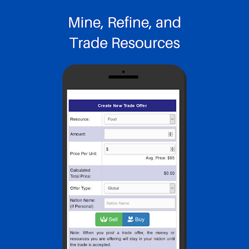 Politics and War is an massively multiplayer online roleplaying game where you create your own country and compete, trade, fight, and politic with thousands of other real players. Forge friendships and treaties, create trade alliances, and wage war with friends, family, and total strangers. Politics and War is free to play and can be played on Android, iOS, and any other device with a web browser. Visit the website at https://politicsandwar.com