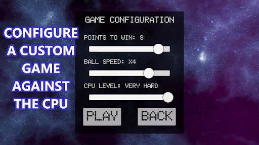 ✔️ You can configure the speed of the ball, the difficulty of the CPU, and the points necessary to win both in Versus and Single mode.