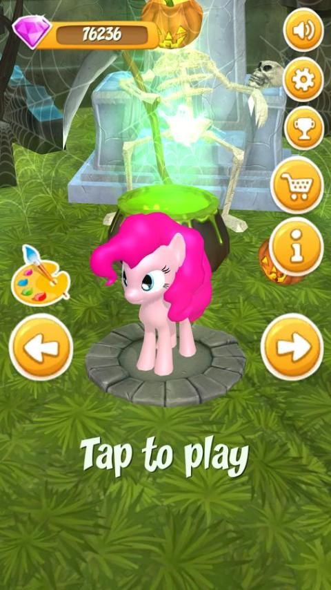 The most mysterious and favourite holiday - Halloween coming soon! The festive party for Pinkie Pye will bring together the most dangerous vampires werewolves and zombies. But what is Halloween without the main symbol of this night - the Lamp of Jack and halloween pumpkinse? Do you know what this is? Well, of course, - an ominously smiling pumpkin, with a candle inside, which is designed to drive away evil spirits and help the evilness to find the way to the Cemetery. Little Pony Pinky Pai is in a hurry - there is very little time left, you need to hurry up and collect as many holiday pumpkins as possible. Colorful runner, saturated with the atmosphere of the holiday will appeal to all fans of Halloween. You are waited by a journey through an ancient abandoned cemetery, on which are hidden glowing pumpkins. Get nice bonuses - bombs, crystals, super-acceleration. Hurry up and collect all the Halloween flashlights along with Pinkie Pye and other bronies. Dont waste a time! Choose your favourite pony. Collect halloween pumkins and exchange them on your favourite ponies! Upgrade your bonuses and skills!