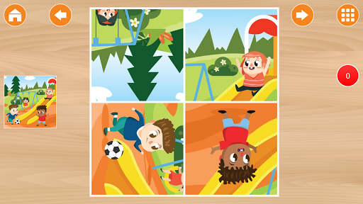 The children complete the picture leaving scattered puzzle pieces to their right places.