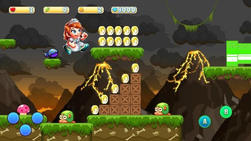 One of the best princess adventure games with levels is available now , so she needs your help to put an end to the curse , she facing many enemies that will try to stop her to complete this mission like sorcerer who wants to steal her magical amulet , beetle , biddy , squid-like that appear in water-based level , wind-up bombs , flying ghosts , bullet-like projectiles , quadruped turtle-like , ball and chain with large tooth-filled maws and incessant biting...and a lot of dangerous obstacles ; but she has some special magic powers such as fireball-throwing and size-changing into giant and miniature sizes , so great care must be taken when you start this adventure . don't forget to hit the blocks to receive either coins or power-ups.