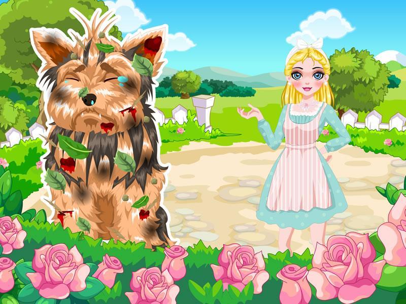 The princess found a wounded stray dog in the back garden of the palace. She decided to help the puppy. Let's help the princess clean the body and heal the dog and put on the beautiful clothes.