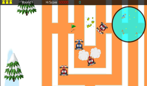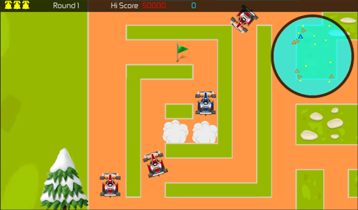 Eat all of flags. Beware the red cars and stones. The exhaust can slow down the red cars. Could you eat all flags before time running out?