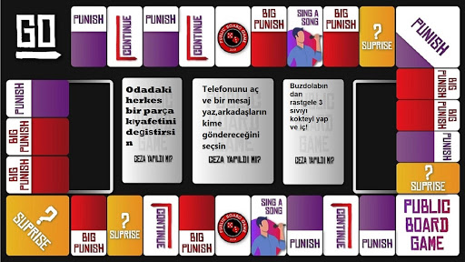 Various obstacles such as confession, punishment, surprise, sing, earn game points or continue will appear on the track.You have thrown the dice and when you hit the related obstacle, your punishment-surprise will appear on your card randomly. But penalties can be heavier than you know! If you do not do the penalties, you will not be able to earn game points, and you will provide great convenience to your opponent. You can purchase surprise cards with your game points in the game and apply these cards to your friends to make the game more enjoyable. Good luck in advance!