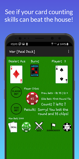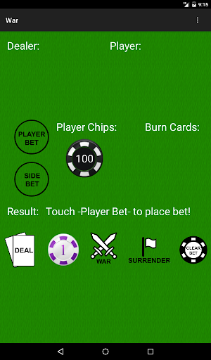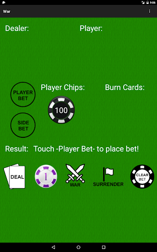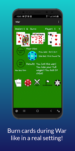 It's Player vs. Casino in this Casino War card game! Although this card game is based off of the classic war card game, PvC: War Card Game includes simulated playing chips to mimic playing the war card game at the Casino (Casino War)!