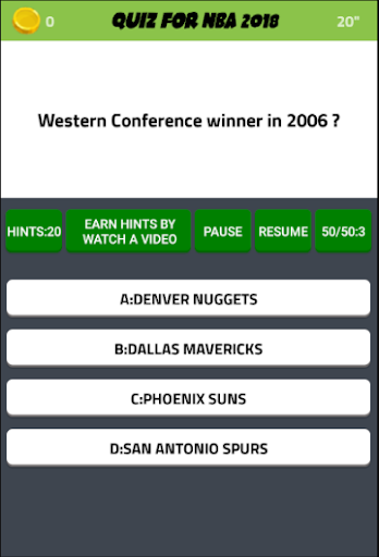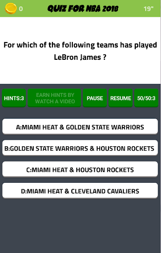 Quiz for NBA 2018 is a Questions - Answers quiz trivia game about NBA Basketball players and teams. There are Random Questions for teams, players and coaches from different categories(wins, results, scores, trophies, and more).