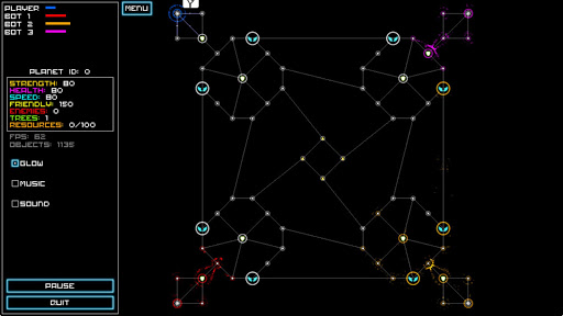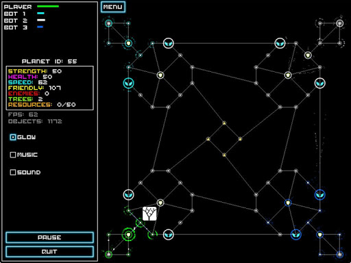 Quantum is a realtime strategy in the spirit of Galcon and Eufloria. You are in control of creatures that orbit planets. You can colonize new planets by moving creatures to them. To create new Creatures you have to build trees on the planets. The new born creatures will then inherit certain properties from their home planet. The goal of the game is it to eliminate all enemy creatures and overtake all their planets.