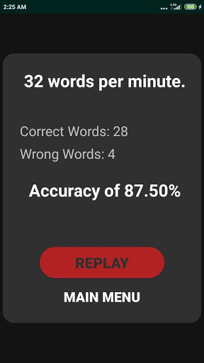 In end of 60 seconds accuracy, words per minute, correct, wrong words will be calculated and displayed on the screen with all of the words.