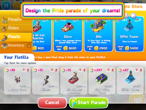• Be Creative! Create and launch Pride parades by designing your own flotillas, with tons of flamboyant and fun floats to choose from - including bikers, LGBT flag-bearers, giant boom boxes, the Eiffel Tower and more!