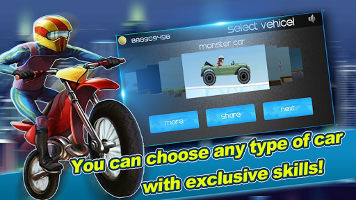 Control your car or bike to climb hills with most realistic control to face the challenges of unique uphill & downhill environments. Gain bonuses from tricks and collect coins to upgrade your car and reach even higher distances.