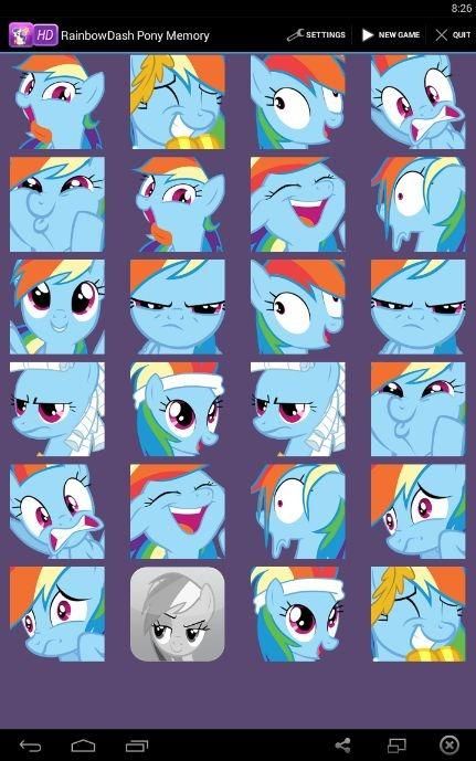 Do you want to improve your memory and have fun at the same time? There is nothing better than this classic game. The kids will love it! Are you ready to play? RainbowDash Pony Memory Game suitable for everyone, regardless of age and gender. This RainbowDash Pony Memory Game will help you to relax or pass the time. The object of the game is to turn over pairs of matching RainbowDash's. Finally, a game you never feel guilty playing that never leaves you bored! All Logos & brands shown or represented in this game are copyright and or trademark of their respective corporations. This trivia game is for fun and knowledge. Please note company or event logos are protected by copyright and/or trademark registration .