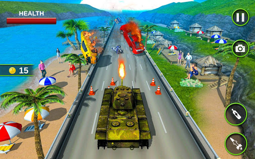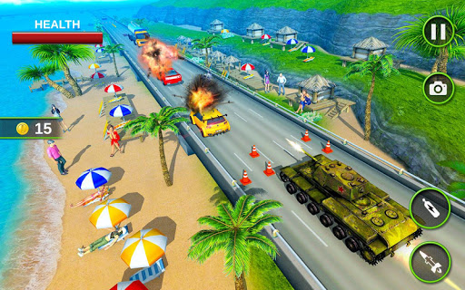 Drive the most realistic battle tanks and mini tanks in this free tank racer. Are you a fan of the Real Tank Fighting Traffic Riding 3D game? Then drive the huge game. The aim is to cover more distance as you can hit the traffic like mega transport cars, heavy bikes, and other super stunt vehicles but careful from the huge truck vehicles.