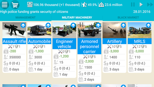 - Conduct army drills (there more than 10 kinds of military weaponry available to you).
