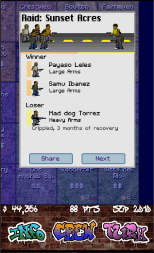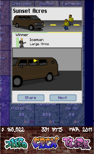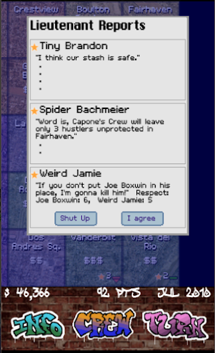 Respect is a tactical game of keeping one step ahead of your enemies. You manage your soldiers, upgrade your weapons, and compete for the best corners in the city. Use spies to track down your rivals' stash houses, and drive-bys to soften your enemies. Bolster your defenses with heavy weaponry and send your hardest soldiers to execute unexpected raids. But don't forget to keep an eye on your own men; out on the streets, RESPECT is everything and disloyalty is your greatest enemy. If a soldier steps out of line, you need to respond. Settle disputes, promote lieutenants, throw lavish parties, track down valuable rumors, intimidate snitches and keep off the heat with crooked lawyers to protect your crew.