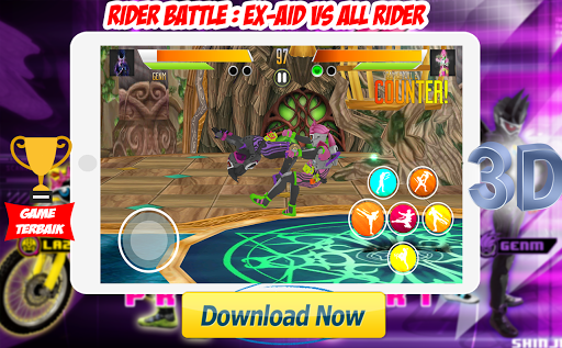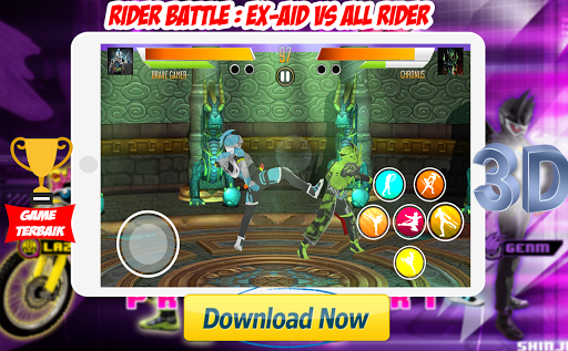 Rider Battle : Ex-Aid Vs All Rider Ultimate Fight 3D is adventure game set in the ex-aid gashat. Players will be able to fight with their favorite characters and discover a new gameplay style set in thrilling 3D environments with a graphic style completely different from the rider ex-aid henshin series.
