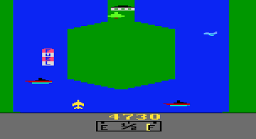 You fly a jet up a river in an attempt to destroy bridges which are vital to the enemy. The river is heavily guarded, however, with balloons, ships, choppers, and enemy aircraft trying to stop you. Along the way you will need to fly over fuel stations to refuel your jet and keep flying.