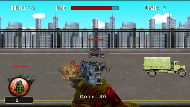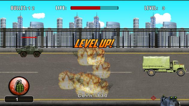 You are a soldier on the side line protecting an army truck on the road which is being followed by enemy soldiers in jeeps, armored vehicles and other military vehicles firing at your truck. Use your big weapons to protect your supply truck from the enemy forces. You have a variety of guns to stop the enemy and can also launch grenades. As you progress in this road fighter game. you also have to shoot down Apache combat helicopters. Test your shooting skills in this intense shooter game!