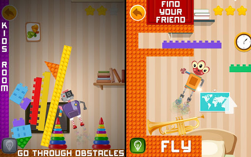 Then race the Bots in a kid's room, finding your way through the building blocks, toy cars, bouncing balls, musical instruments, etc. Fly, jump, bounce, change directions, speed up - make sure your Robot is built perfectly. On your way collect the 3 stars and find the red door to meet your friend robot.