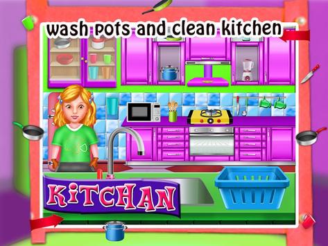 Kids start from the kitchen to clean first. They wash all dishes and plates and then adjust them on their proper place. Fill shelves and cabinets from pots and the kitchen look so much beautiful.
