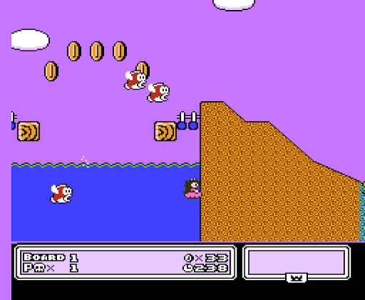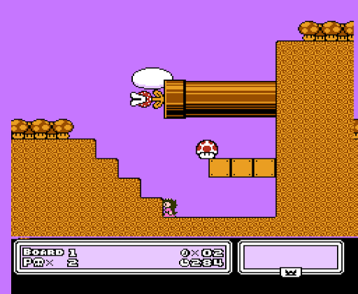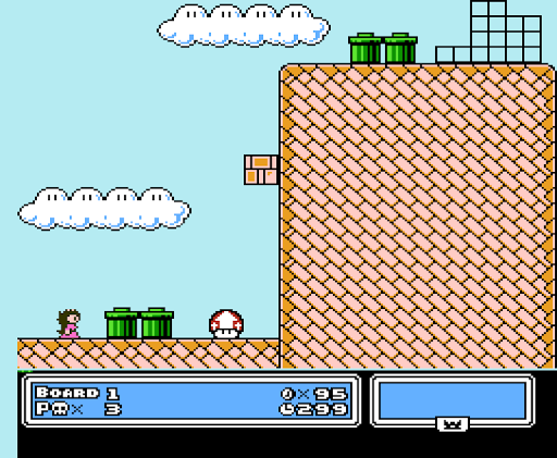 The player navigates through the game via two game screens: an overworld map and a level playfield. The overworld map displays an overhead representation of the kingdom and has several paths leading from the entrance to a castle. Paths connect to action panels, fortresses, and other map icons, and allow players to take different routes to reach the kingdom's goal. Moving the on-screen character to an action panel or fortress will allow access to that level's playfield, a linear stage populated with obstacles and enemies. The majority of the game takes place in these levels, with the player traversing the stage by running, jumping, flying, swimming, and dodging or defeating enemies.