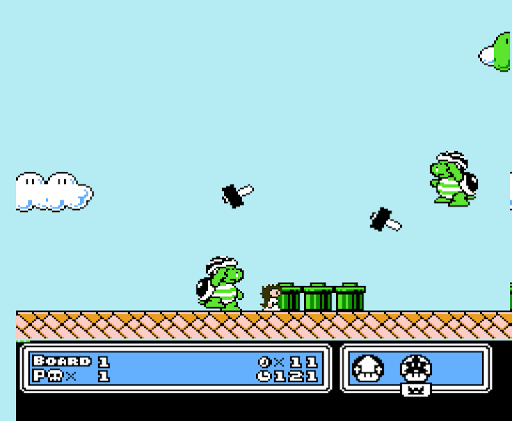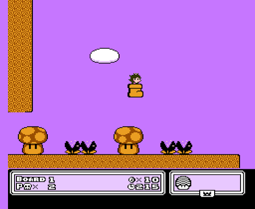 Completing stages allows the player to progress through the overworld map. Mini-games and bonus screens on the map provide the player a chance to obtain special power-ups and additional lives. Power-ups obtained in these mini-games are stored in a reserve until activated by the player from the map screen. There is a final stage with a Boss to defeat.