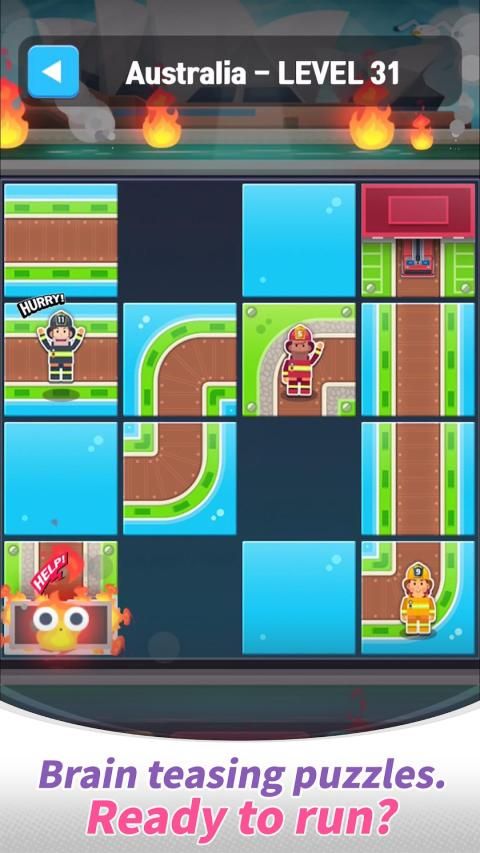 Move the tiles to make way for the fire truck to pick up the fireman and run to fire!