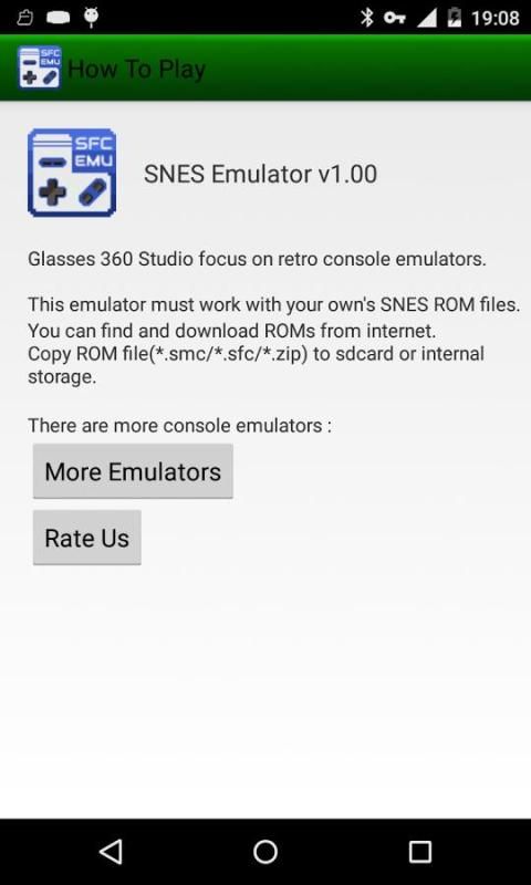 This app must work with your own's SFC/SNES ROM files, You can find and download ROM files from web. Put the downloaded ROM files in SDCard & Internal storage. This console emulator will find the ROM files automatically.