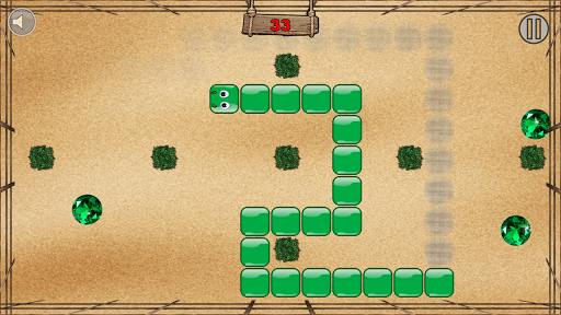 The player controls a snake on a 2D surface. Currently the primary obstacle is the snake's own body, which grows as you collect precious gems. Each gem has it's own properties - the most expensive ones, the rubies, stay shorter, but give the highest points per stone, three. The emerald stone stays a little bit longer on screen, but gives you smaller reward - two points. The longest staying gem, the topaz, gives you only one point.