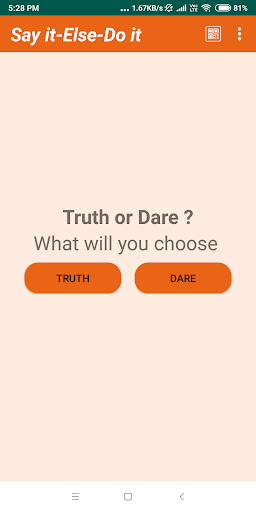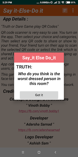 Start playing “Say It-Else-Do It” to play online/Offline truth or dare. Of course truth or dare are really exciting game to play. Say It-Else-Do It allows you to play truth or dare online/Offline based on the chosen set of questions. To make it even secretive those questions would be encrypting/Decrypting as QR codes. It allows you to play even when your players aren’t nearby.