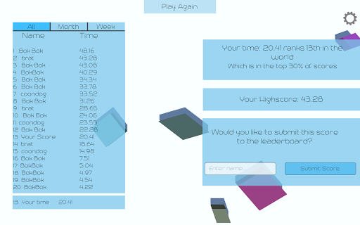 In Scatter you must guide your cube through an ever-quickening flurry of blocks. Over time blocks will move quicker and increase in number. Only those with the quickest reflexes will make it to the leaderboards! Avoid the blocks as best you can.