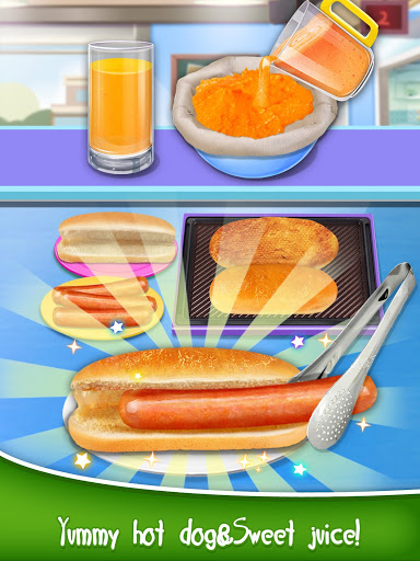 It's time to back to school. What is your favorite for your school lunch food? How about a hot dog with them boiling in the oil makes me hungry. Don’t forget to drink some juice. Choose the flavor you like. Combine whatever you like. Bring your tray to require for your delicious lunch food right now.