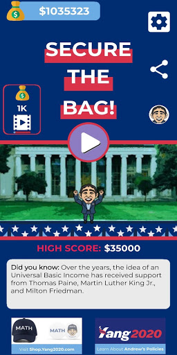 The Secure The Bag! Game is not officially affiliated with the Andrew Yang 2020 campaign, but obviously the guys behind it are 100% Yang Gang.
