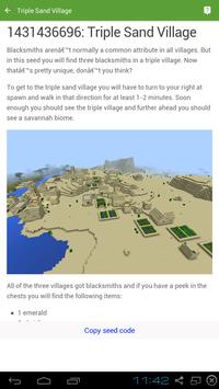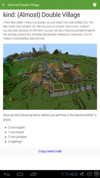 This is the #1 App seed for Minecraft Pocket Edition! With mine seeds you can browse over 500 minecraft seeds for all version of minecraft game. Using extremely simple, You just copy the code seeds and then on game minecraft create a new world with seed copied code!