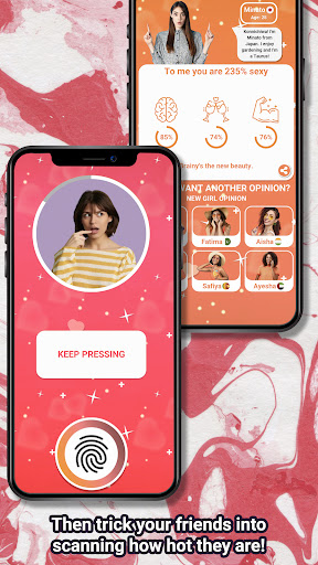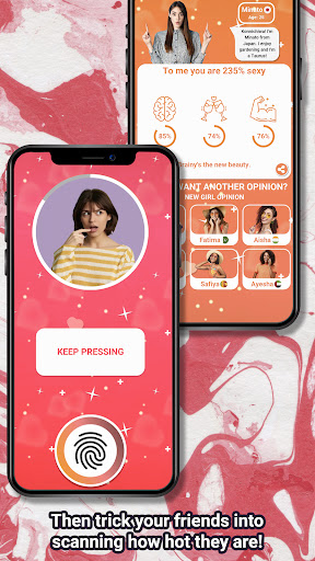 Sex Appeal Hotness Prank Scan is a small prank detector like app used for fun. It simulates a finger scanner but your phone does not really measure how attractive you are. Use it to play games like hot or not with your friends and be surprised with positive motivational self care fun messages from good looking adult women and girls acting as simulated judges