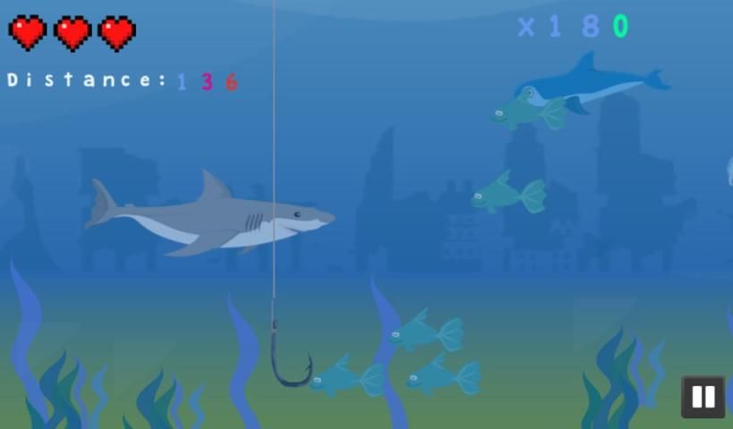 - One touch control (hold down on the screen to let the shark rise up to dodge obstacles or eat its dinner)