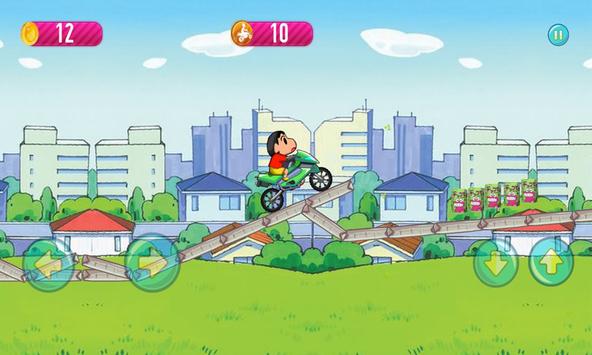 In this chan world of kasukabe city, our shin boy has to ride his super bike while collecting all the crayon candy and coins to hit the top 1 highscore in japan.