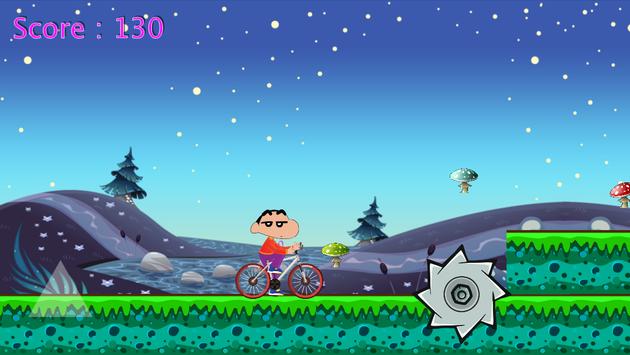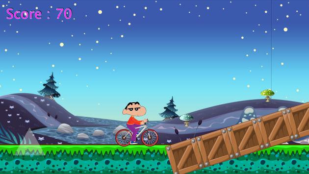 Shin-Chan rides and drives fast bike. Collect all coins and don't bump obstacle to make best score.