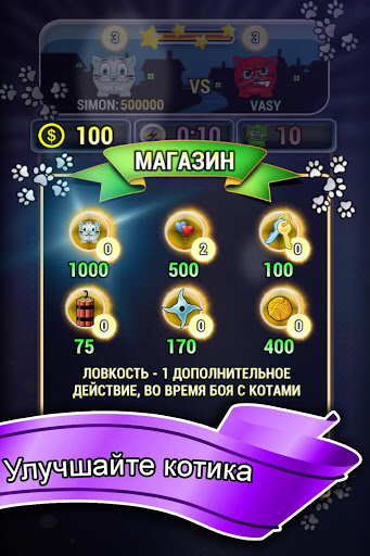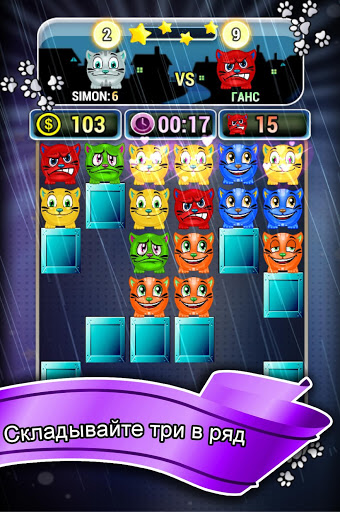 Meet the cute kitty Simon, as usual in the evening he escaped from the owners and went on an unusual adventure. So, he returned home safely, you need to help him, to help defeat the other cats, who will disturb him. Puzzle - arcade in the genre of match 3, show the talent and ingenuity to get the cat Simon's home.