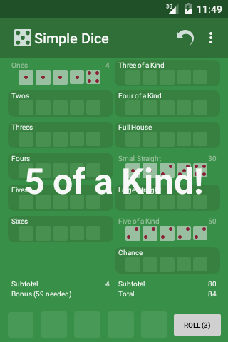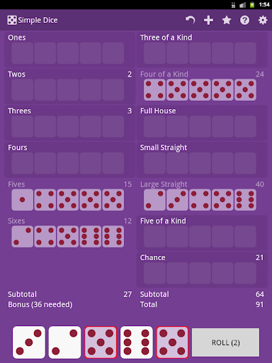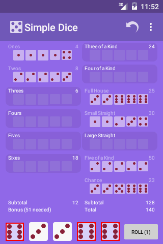 Roll the dice and contemplate your next move. Simple Dice is a game of strategy and chance. Whether you choose to save your roll and earn the allotted points for a three of a kind, or keep trying for a 40 -point large straight, this will have you crossing your fingers for that lucky roll.