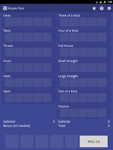 The simple interface makes it easy to see how many points each score category will offer your roll by displaying potential points next to each one, but it won't make the decision for you. What you choose to do with each roll is up to you. There are thirteen score categories displayed on the screen above your roll. You get three chances to roll and save rolls for that desired score before you must choose a score category. Each category can only be used once.
