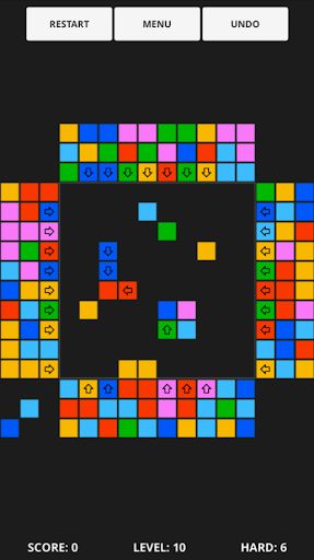 In the begining you will get random placed blocks on the main board. You may click on blocks from the side part. It is the only kind of your activity. A clicked block may start moving across the central zone until it meets another block on its way. THis kind of blocks has an arrow indicating the direction of the movement. When an another block is removed on the way, the block continues moving in the same direction. If 3 or more blocks of the same color are gathered together (diagonal contact is not valid) they explode and the player gaines points.