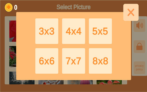 You can choose the size of the board between 3x3, 4x4, 5x5, 6x6, 7x7 and 8x8 tiles blocks for more challenge!