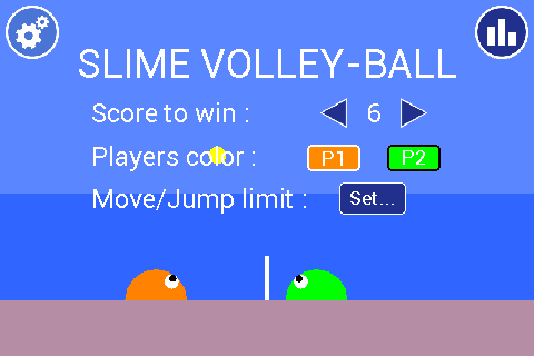 Your aim is simple : put the ball into the ground of your opponent before he does. But it's not that easy : the circular shape of Slime makes controlling the ball difficult !