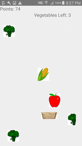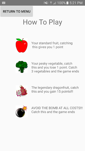 Fruits to stack: Apple, Banana, and Dragon-fruit (offers large bonus) Things to avoid catching: Broccoli, Corn, and Bombs