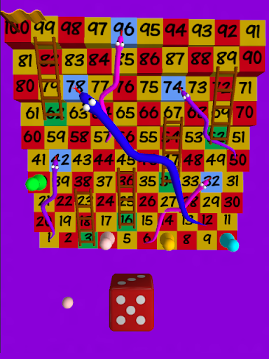 The aim of the game is to reach the top square by climbing the ladders and avoiding the snakes! If you land at the bottom of a ladder you climb to the top... but if you land at the top of a snake you slide all the way down its back to its tail!