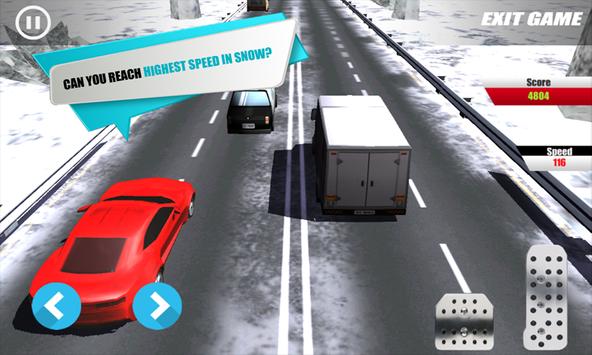 The game has 5 exciting modes which will test your skill & speed. Mode 1 is simple endless racing on snowy highway with challenging AI traffic, in this mode you have to cross as many as cars & truck you can to get maximum points. Based in endless racing game play several different modes are introduced for extreme addictive environment & challenge, each mode had its own unique defined objective & challenge. So buckle up for this scream ride. Two different racing tracks are given to make your journey more exciting & wonderful.